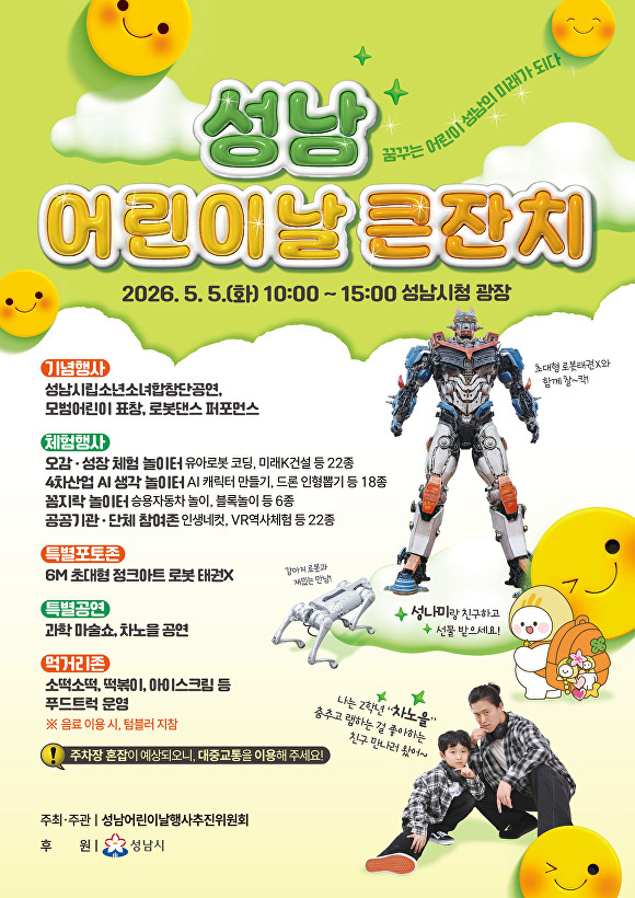 박남희 시 아동친화팀장은 “이번 어린이날 행사는 초대형 로봇 태권, 인공지능 로봇 타이탄 등 미래 기술을 직접 체험할 수 있는 대형 놀이터로 꾸며진다”면서 “87개의 다채로운 프로그램을 통해 온 가족이 특별한 하루를 보내길 바란다”고 말했다.
