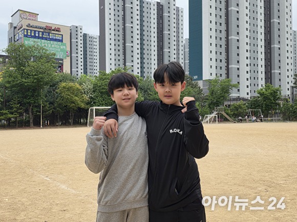 김서율, 홍승범 선수가 용죽초 운동장에서 인터뷰를 마치고 화이팅을 하고 있다. [사진=이윤 기자]
