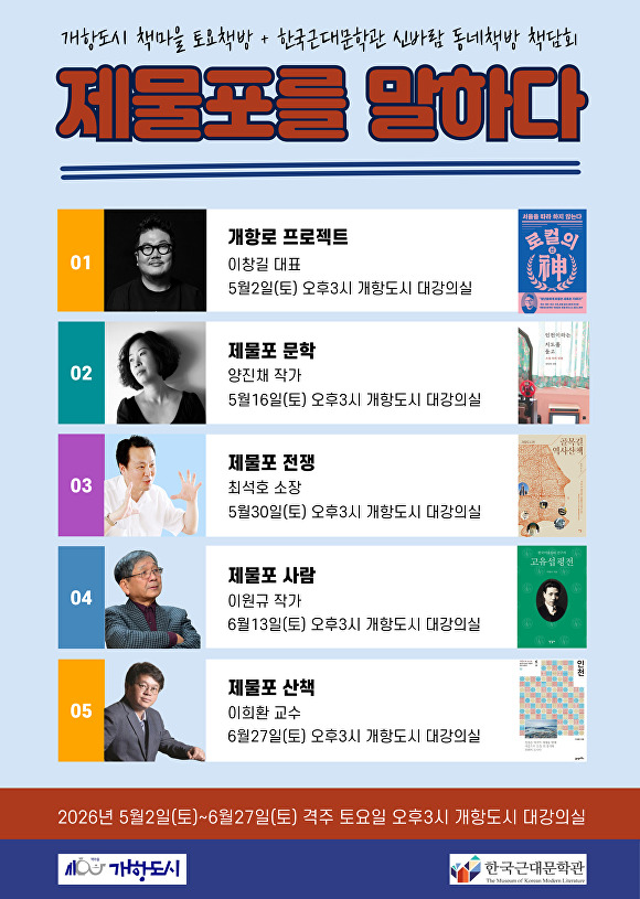 5월 2일부터 6월 27일까지 격주 토요일 오후 3시 개항도시 2층 대강의실에서 개최한다. 세 차례는 개항도시 책마을에서 토요책방으로 개최한다. 제1강 이창길 마계인천대표 “개항로 프로젝트”, 제4강 이원규 작가 “제물포 사람 고유섭”, 제5강 이희환 교수 “제물포 산책” 등이다.