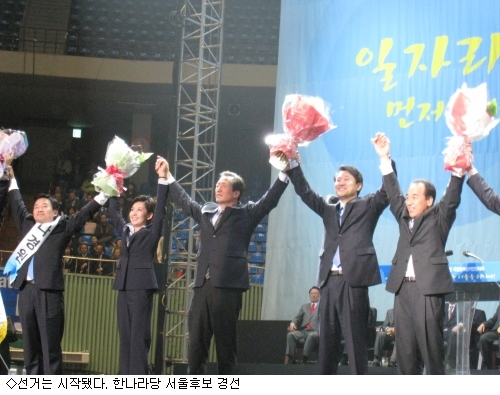 한나라당은 지난 3일 경선에서 오 후보가 나경원, 김충환 예비후보를 물리치고 여당 시장 후보로 확정됐다. 민주당은 6일 한명숙 예비후보와 이계안(@seoul_kyeahnlee) 예비후보가 경선을 앞두고 있지만 한명숙으로 무게추가 기울고 있다.