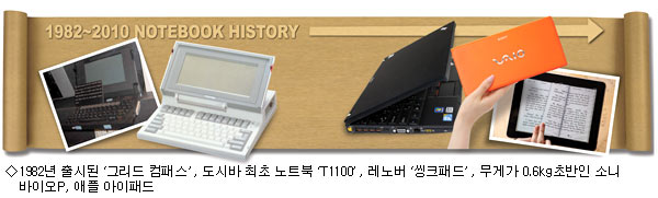 2010년은 노트북 컴퓨터 분야에 꽤 의미있는 해다. 지난 1분기 국내 노트북 출하량이 처음으로 데스크톱 출하량을 넘었다. 지난 6월은 노트북의 원조라는 평가를 받기도 하는 도시바가 첫 노트북을 출시한지 25주년이 되는 달이다. 또 지난 4월 아이패드의 등장으로 노트북이 태블릿의 정면 도전을 받게 되는 원년이기도 하다. 노트북이 처음 등장한 1980년대부터 지금까지의 변천사를 살펴봤다.