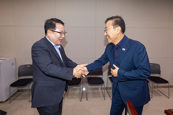 정헌율 익산시장(좌)이 김윤덕 국토부 장관을 만나 반갑게 악수를 나누고 있다. [사진=익산시 ]