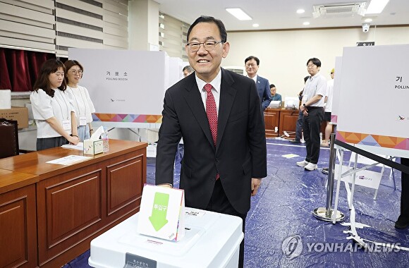 주호영 대구선대위원장(중앙선대위 공동선대위원장)이 지난달 29일 대구 수성구의회에 마련된 범어1동 사전투표소에서 투표하고 있다. [사진=연합뉴스]