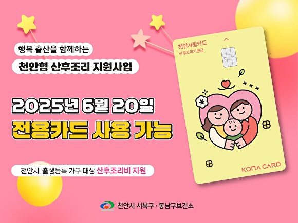 [아이뉴스24 정종윤 기자] 충남 천안시가 오는 20일 ‘행복출산 천안형 산후조리 지원사업’ 전용카드를 출시한다.