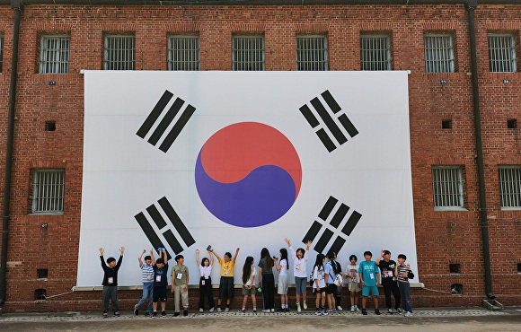 서대문형무소에 걸린 태극기를 배경으로 학생들이 기념사진을 촬영하고 있다 [사진=달성군]