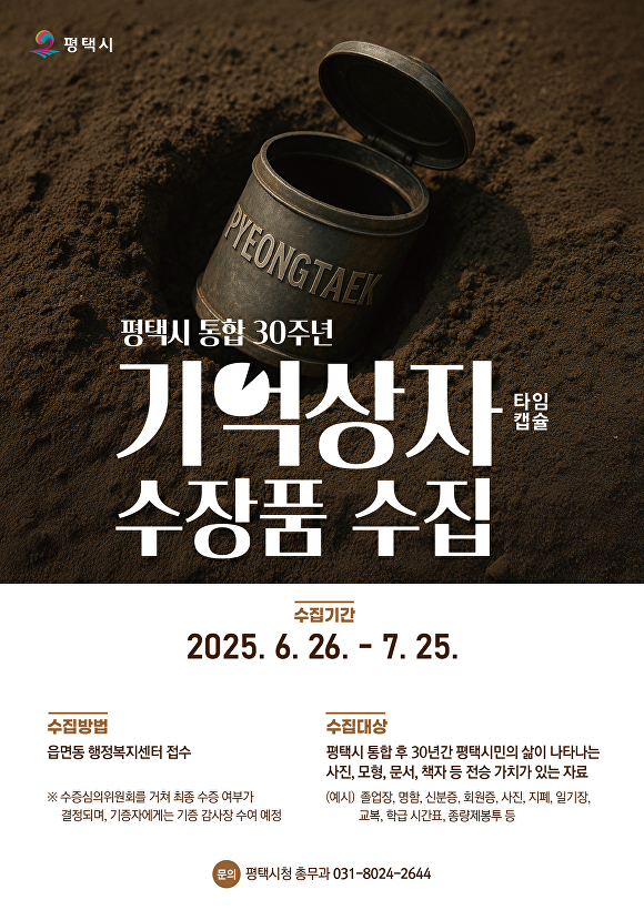 [아이뉴스24 임정규 기자] 경기도 평택시가 통합 30주년을 맞아 시민들의 삶과 도시의 변화를 기록할 '기억상자(타임캡슐)'에 담을 수장품을 모집한다고 4일 밝혔다.