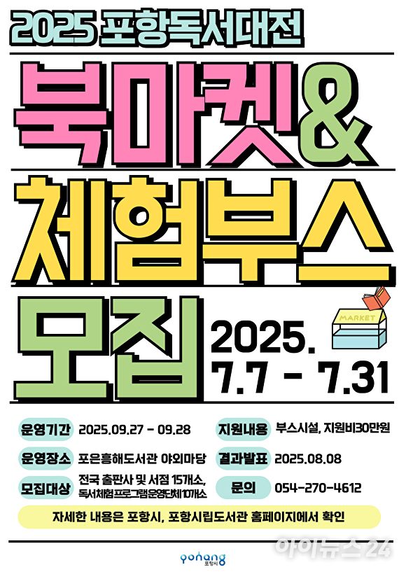[아이뉴스24 이진우 기자] 경북 포항시는 '2025 포항독서대전' 북마켓 및 체험부스 운영 단체를 오는 31일까지 모집한다고 7일 밝혔다.