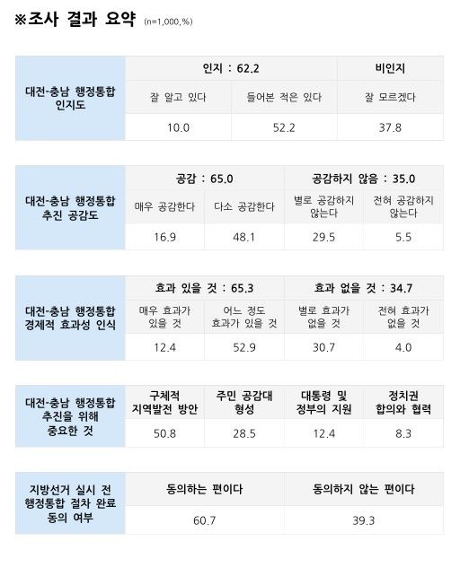 행정통합민관협의체에 따르면, 이번 조사는 문화일보가 여론조사 전문기관 엠브레인퍼블릭에 의뢰해 지난 11일부터 14일까지 대전·충남 거주 18세 이상 성인 1000명을 대상으로 온라인 방식으로 실시한 것이다. 표본오차는 95% 신뢰수준에서 ±3.1%포인트다.