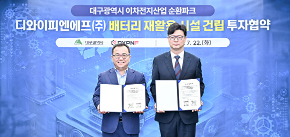 대구시는 22일 산격청사 대회의실에서 디와이피엔에프㈜(대표 유병욱)와 ‘사용 후 배터리 재활용 공장’ 신설을 위한 투자협약(MOU)을 체결했다고 밝혔다.