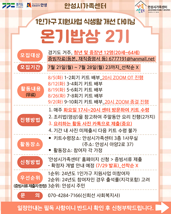 [아이뉴스24 임정규 기자] 경기도 안성시 가족센터가 1인 가구의 건강하고 균형 잡힌 식생활 지원을 위한 '식생활 개선 다이닝 – 온기밥상 2기' 프로그램 참여자를 모집한다.
