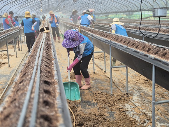 26일 합천군 수해복구 지원활동에 참여한 달성군자원봉사센터 봉사자들이 비닐하우스 내 진흙을 제거 중이다 [사진=달성군]