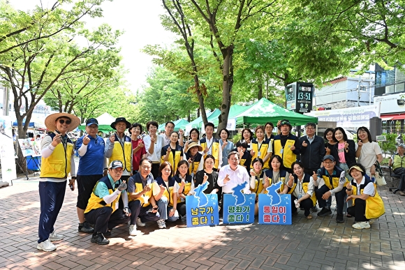 2025 광주 남구 평화통일 시민축제에서 관계자들이 평화통일 관련 패널을 들고 손가락으로 하트를 만들고 있다. [사진=광주 남구]