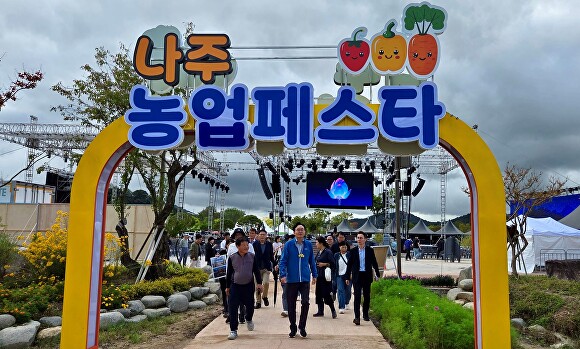 윤병태 시장이 ‘2025 나주영산강축제’와 함께 진행되는 ‘나주농업페스타’ 현장을 둘러보고 막바지 축제 준비 현황 점검하고 있다. [사진=나주시]
