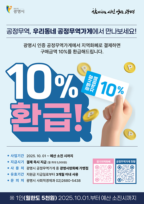 [아이뉴스24 정재수 기자] 경기도 광명시는 공정무역가게에서 광명사랑화폐(지역화폐)로 결제하면 결제 금액의 10%를 돌려주는 ‘공정무역 실천 캐시백’ 행사를 진행한다고 9일 밝혔다.