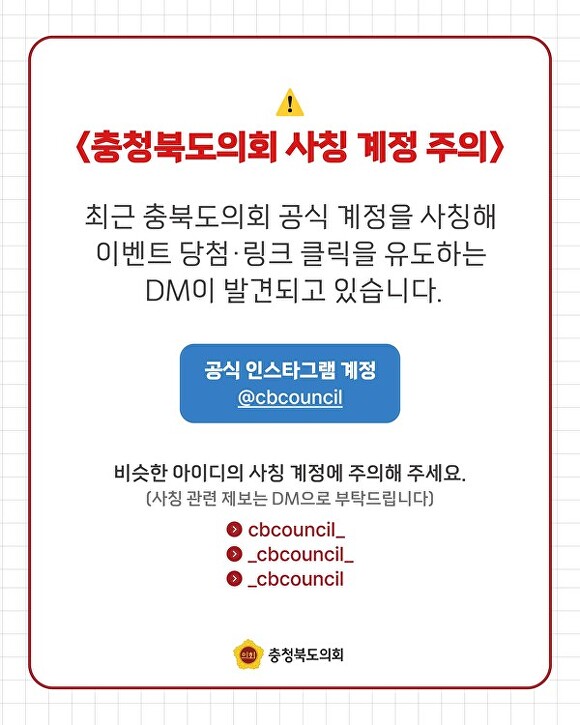 충북도의회는 “사칭 계정으로부터 DM이나 링크를 받았다면 클릭하지 말고, 즉시 해당 계정을 신고·차단해줄 것”을 당부했다.