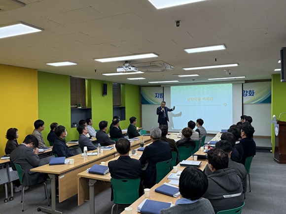 3일 화산체육관 혁신공간에서 진행된 이번 교육은 공단 내 부장, 팀장을 대상으로 조직의 핵심 리더들이 변화에 대응하는 전략적 사고와 혁신 역량을 기르기 위해 마련된 자리다.