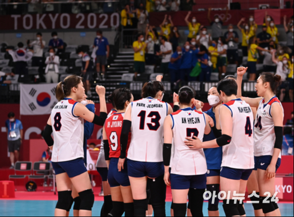 [아이뉴스24 정소희 기자] 6일 오후 일본 도쿄 아리아케 아레나에서 열린 2020 도쿄올림픽 여자 배구 준결승 대한민국 대 브라질의 경기가 진행됐다. 한국 여자 배구대표팀이 세트스코어 0-3(16-25, 16-25, 16-25)으로 패배한 후 파이팅을 외치고 있다.
