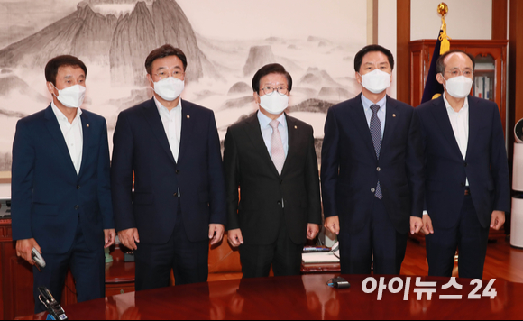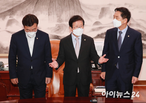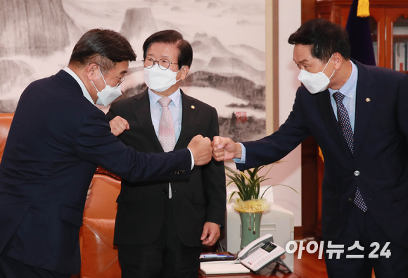 [아이뉴스24 김성진 기자] 윤호중(왼쪽) 더불어민주당 원내대표와 김기현(오른쪽) 국민의힘 원내대표가 31일 오전 서울 여의도 국회의장실에서 박병석(가운데) 국회의장 주재로 회동하며 주먹인사를 하고 있다.