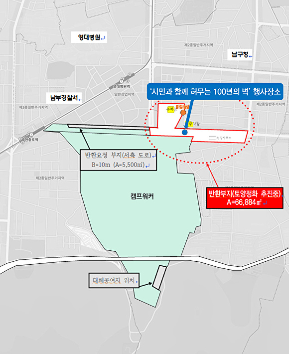 대구시는 반환부지에 대구대표도서관, 대구평화공원·3차 순환도로 등을 신속하게 건설해 남부권 발전의 핵심 거점을 조성할 예정이다.