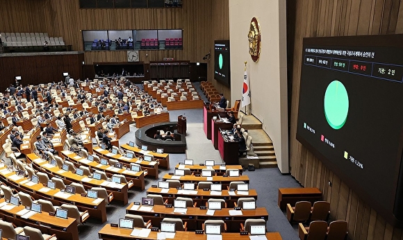 27일 국회 본회의에서 오송 지하차도 참사 진상규명과 재발방지 대책 마련을 위한 국정조사계획서 승인의 건이 통과되고 있다. [사진=연합뉴스]