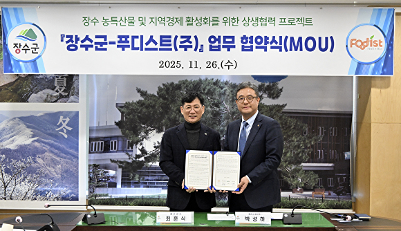 [아이뉴스24 박종수 기자] 전북 장수군은 지난 26일 B2B 식자재 전문 기업인 푸디스트 주식회사(사조그룹 계열)와 지역 경제 활성화와 농가 상생 발전을 위한 전략적 업무협약을 체결했다.